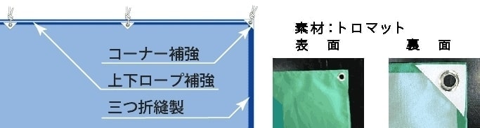 主に屋内での使用に限られます。四方にロープを入れないで三つ折縫製してハトメ補強のみです。屋内では幕が自然に垂れ下がります。特にポンジは横断幕・応援幕の後ろ側からもよく見えるのが特徴です。厚めのトロマットはポンジに比べ高級感があります。(ロープの有無で価格は変わりません。)